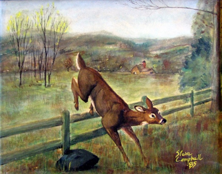 I wanted to copy nature exactly as I saw it, but before I learned how, I enrolled in college as a 4-year art major. “Painting is not photography,” my instructors told me, ad nauseam. “Painting is mood, impression, soul.” So, with their advice, I learned how to be an expressive realist artist. I also learned early to be an inventive one if I wanted to pass my courses. Many of my watercolor paintings from those years have salt, sand, wax, gum arabic, and several other substances needed to pass the course. The fawn and doe painting below has all the previously mentioned ingredients in it.